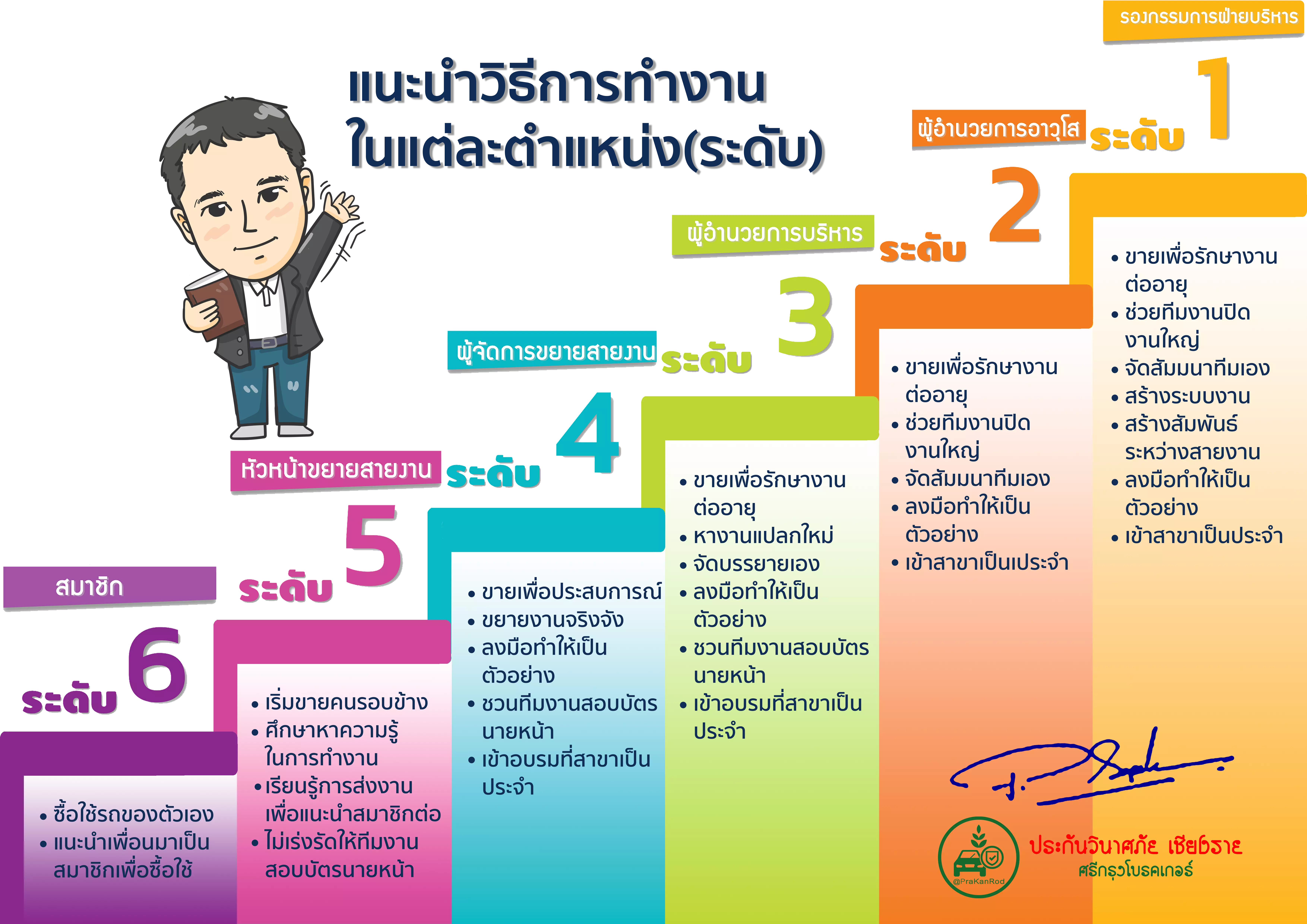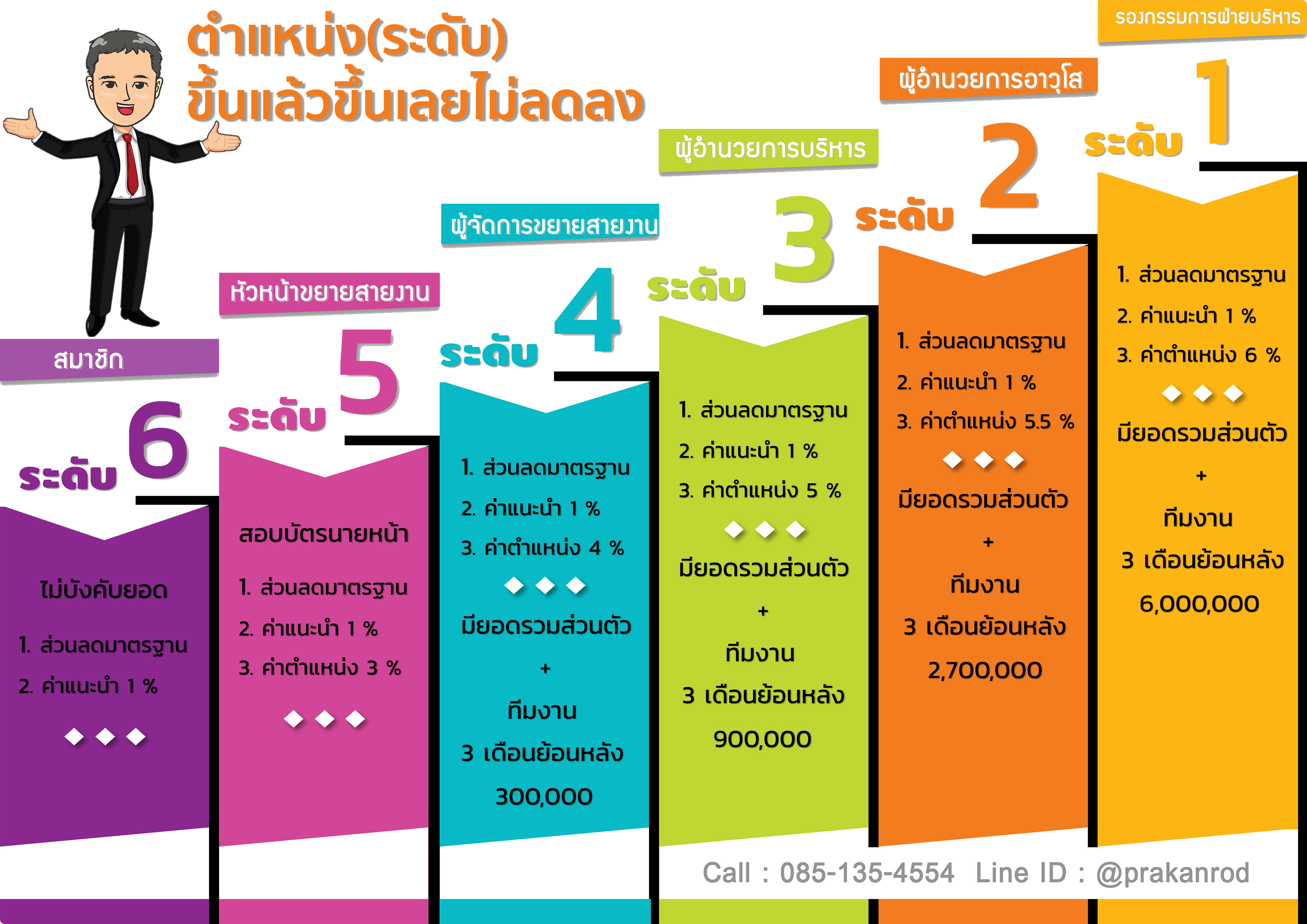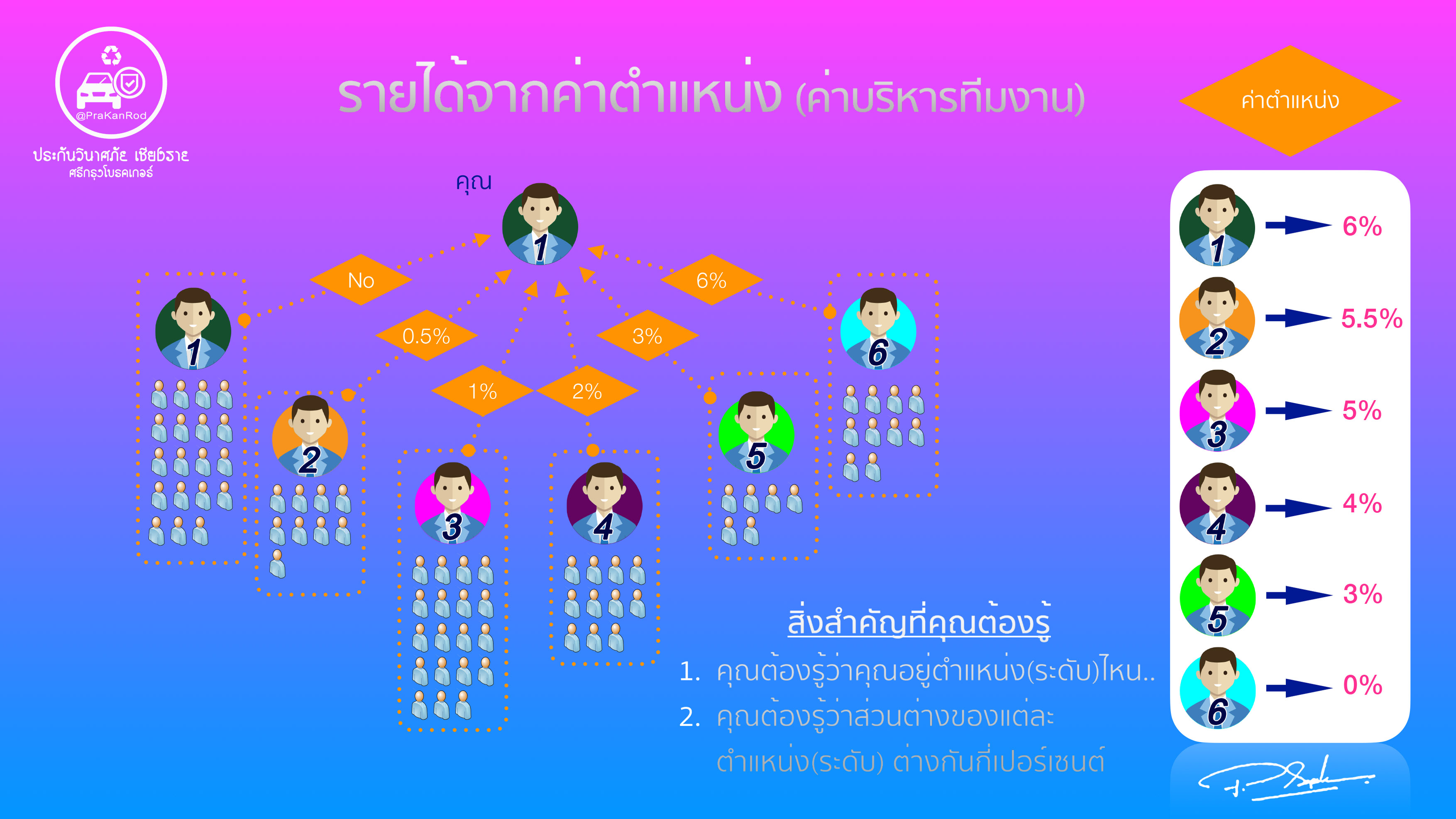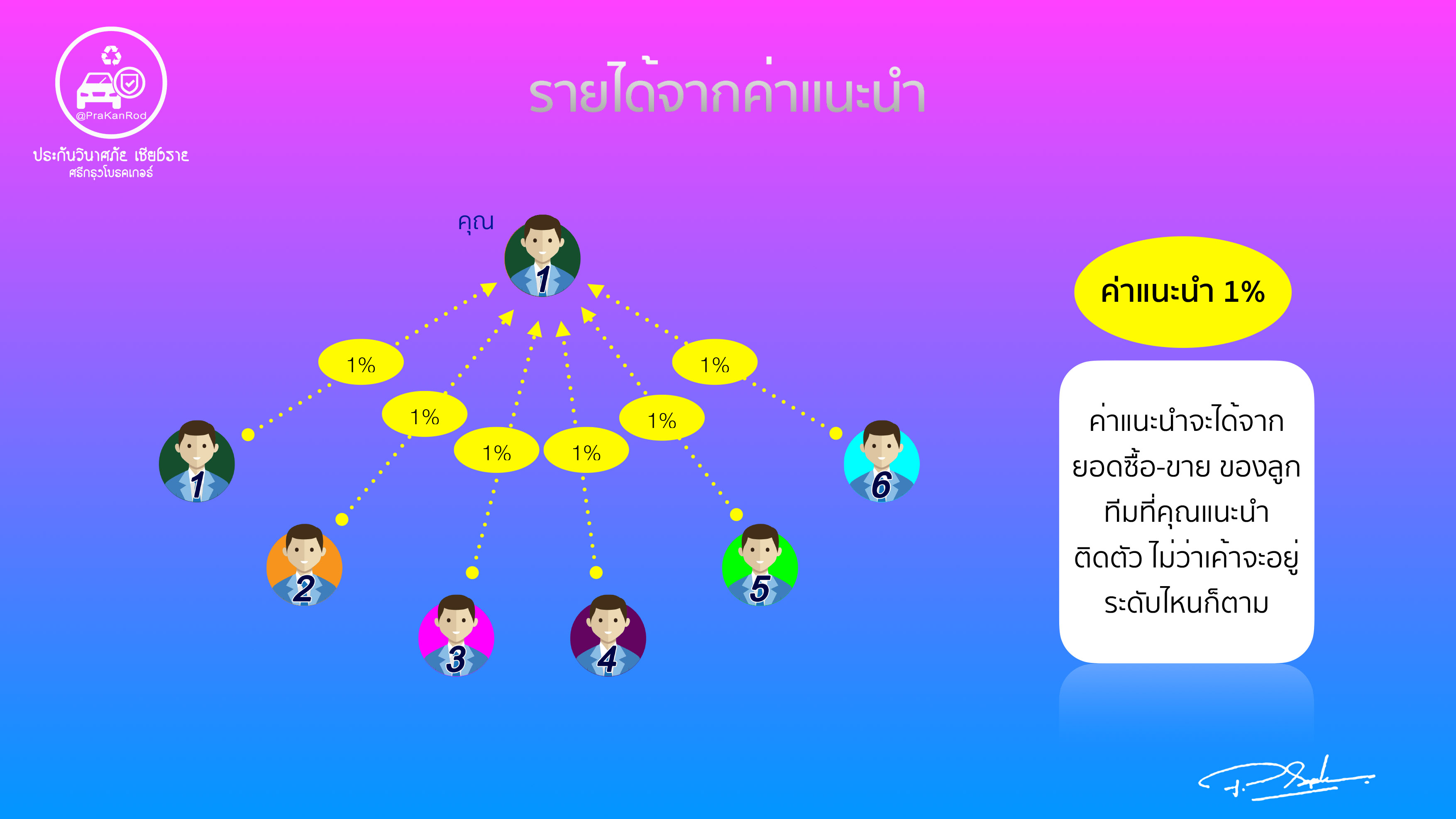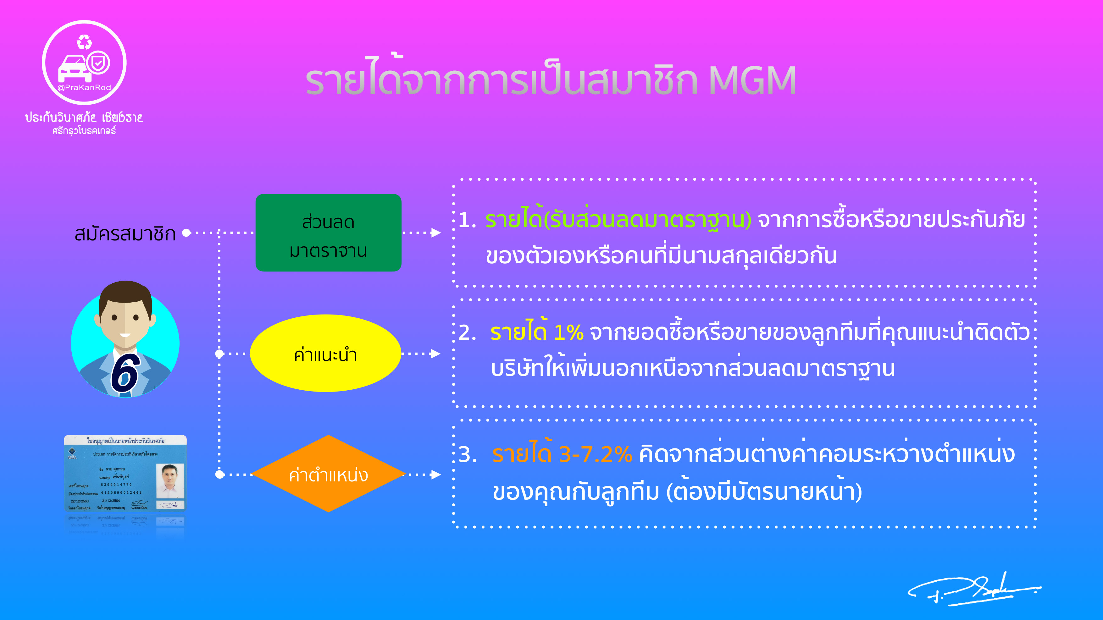 สมาชิกปัจจุบันจะชี้ช่องแนะนําสินค้าและบริการ ให้ผู้บริโภคที่ต้องการสินค้าประกันภัยหรือต้องการทําเป็นธุรกิจสร้างรายได้สมัครเป็นสมาชิกใหม่ โดยสมาชิกปัจจุบันจะได้รับค่าแนะนํา ค่าบริหารทีมงาน(หรือ ค่าตําแหน่ง) ส่วนสมาชิกใหม่จะได้รับส่วนลดเบี้ยประกัน(ส่วนลดมาตรฐาน) และสิทธิประโยชน์อื่นๆ เป็นการตอบแทน