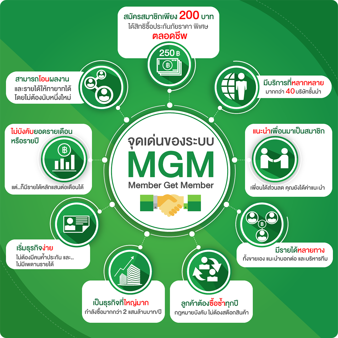 แผนการแนะนำ ชี้ช่องผลิตภัณฑ์และบริการของบริษัทประกันภัยต่างๆ จาก ศรีกรุงโบรคเกอร์ ให้ผู้บริโภค โดยผ่านสมาชิกท่านหนึ่งแนะนำให้กับสมาชิกอีกท่านหนึ่ง ที่ต้องการซื้อผลิตภัณฑ์ แผนการตลาดรูปแบบสมาชิกแนะนำสมาชิก เราเรียกว่า Member get Member (MGM)